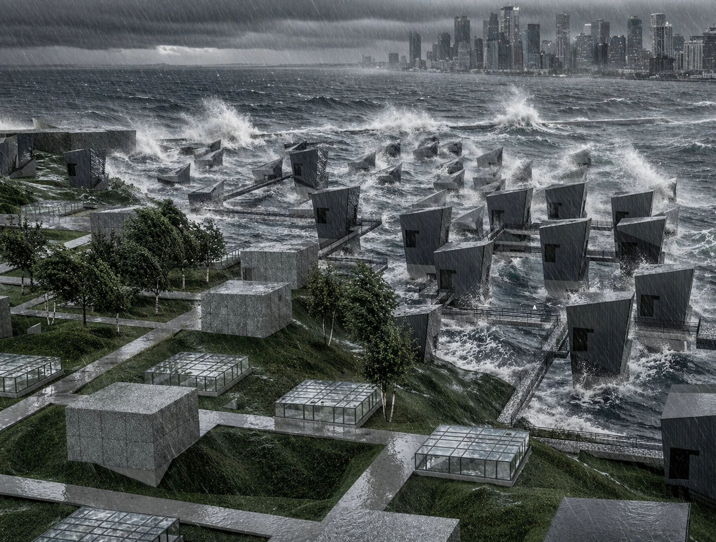The Buffered Bay strategy rejects both fully open and fully closed solutions: operable systems, naturalized edges, and sediment-aware interventions produce a resilient middle ground that preserves ecological quality while reducing harm. This approach aligns with the East River’s evolutionary, not prescriptive, development: build the connective tissue first, then iterate. The shared lesson is to favor systems that learn—edges that register waves as energy sources (wind, light), pavilions that adjust to use, marshes that grow with sediment—to absorb change rather than resist it outright.