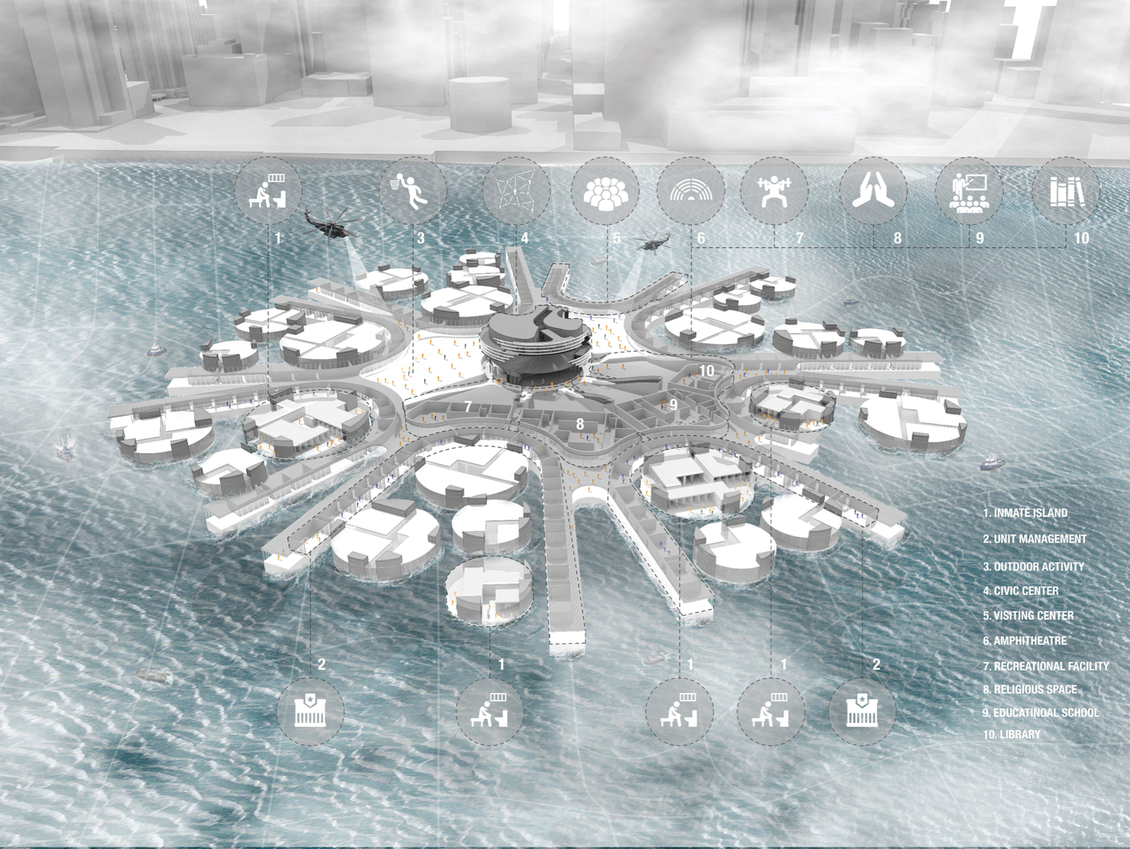 The team catalogued contemporary prison typologies—from high-security institutions to community-based halfway houses—and analyzed their spatial logics. Case studies included the Danish State Prison, the Rehabilitation of Palencia Prison (Spain), and speculative proposals such as the Pacific Ocean Platform Prison and Hydroelectric Waterfall Prison. Each revealed a shift from total control to layered transparency, where architecture negotiates between visibility, autonomy, and care.